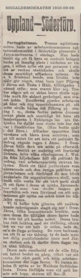 En herr Walden får ironiskt ett tack av redaktionen för sin förföljeselusta, vilken stärkt motstånd till de borgerliga. Vem Walden är framgår inte. Sannolikt Johan Walden, en röststark liberal i kommunalstämman som ägde marken Tästa i Hölö och Pilkrog i Järna. Så kunde det se ut i Järna 1910.