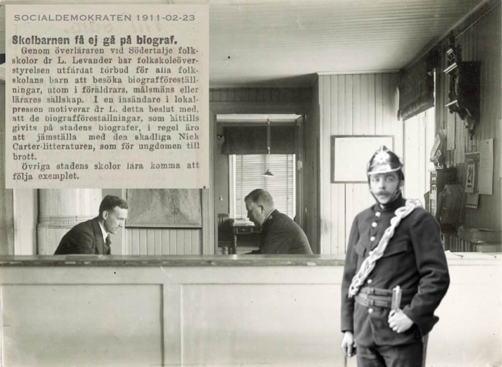 1911 års biografförordning (statlig reglering av filmvisning) – fokuserade främst på tillstånd och censur. Åldersgränser kontrollerades noga, och släppte man in barn på förbjuden föreställning kunde tillståndet dras in. I Södertälje gick till och med överläraren in och förbjöd skolbarn att gå på bio utan vuxet sällskap.